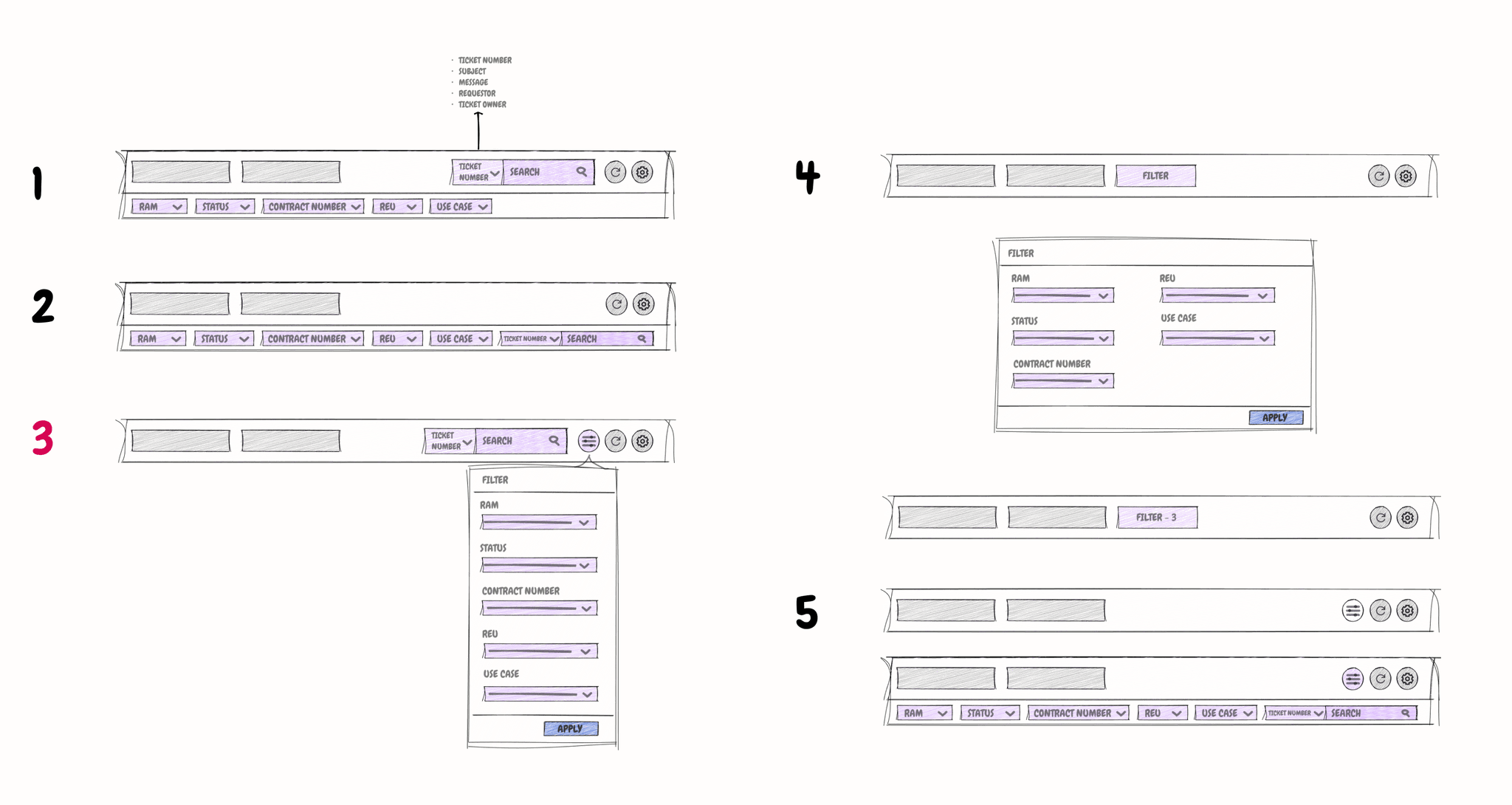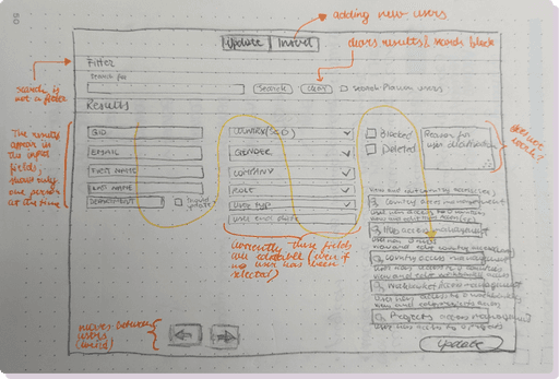 Using quick sketches, I explored several layout and interaction concepts. This was an iterative process with frequent check-ins with the Product Manager and developers to ensure alignment. Key sketches included multiple designs for the table headers and filters, which allowed me to test layout scalability and interaction efficiency.