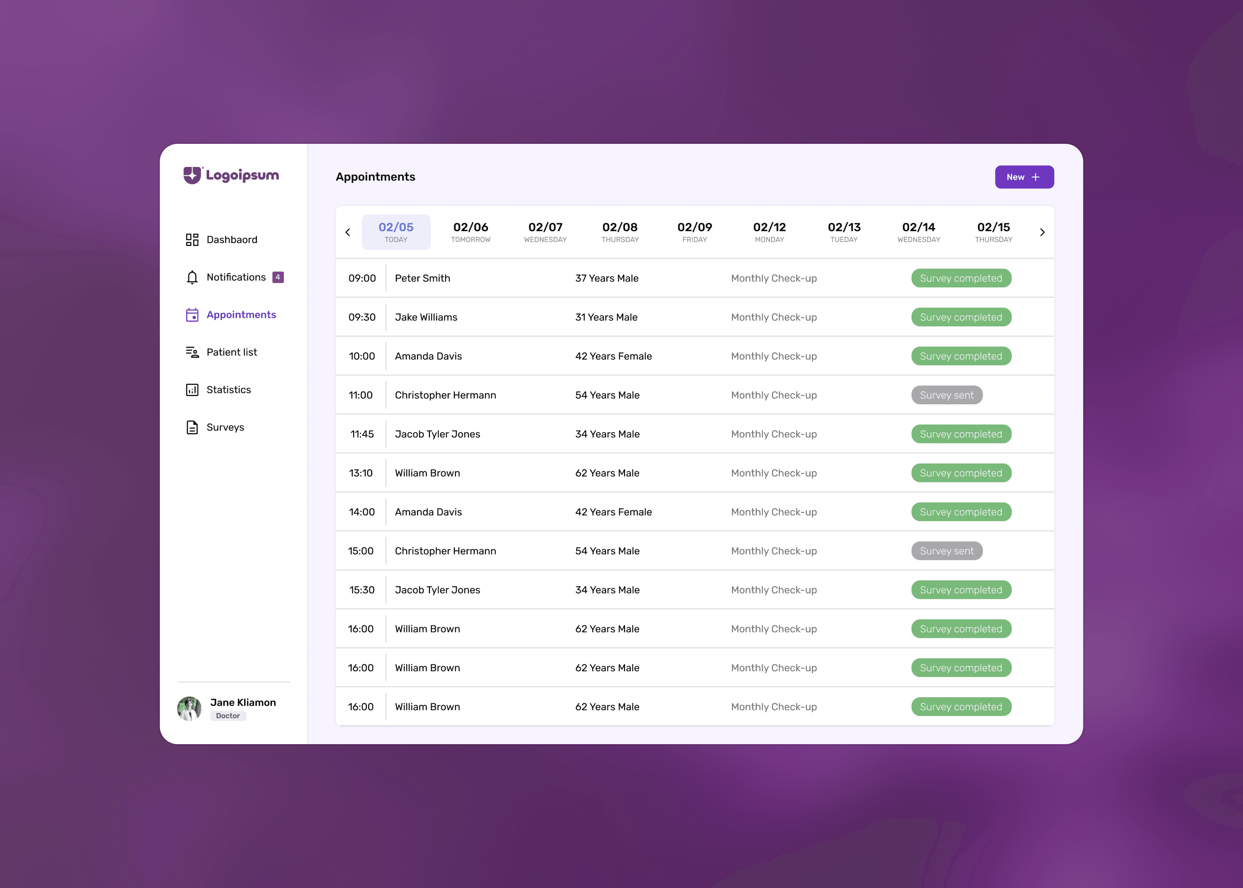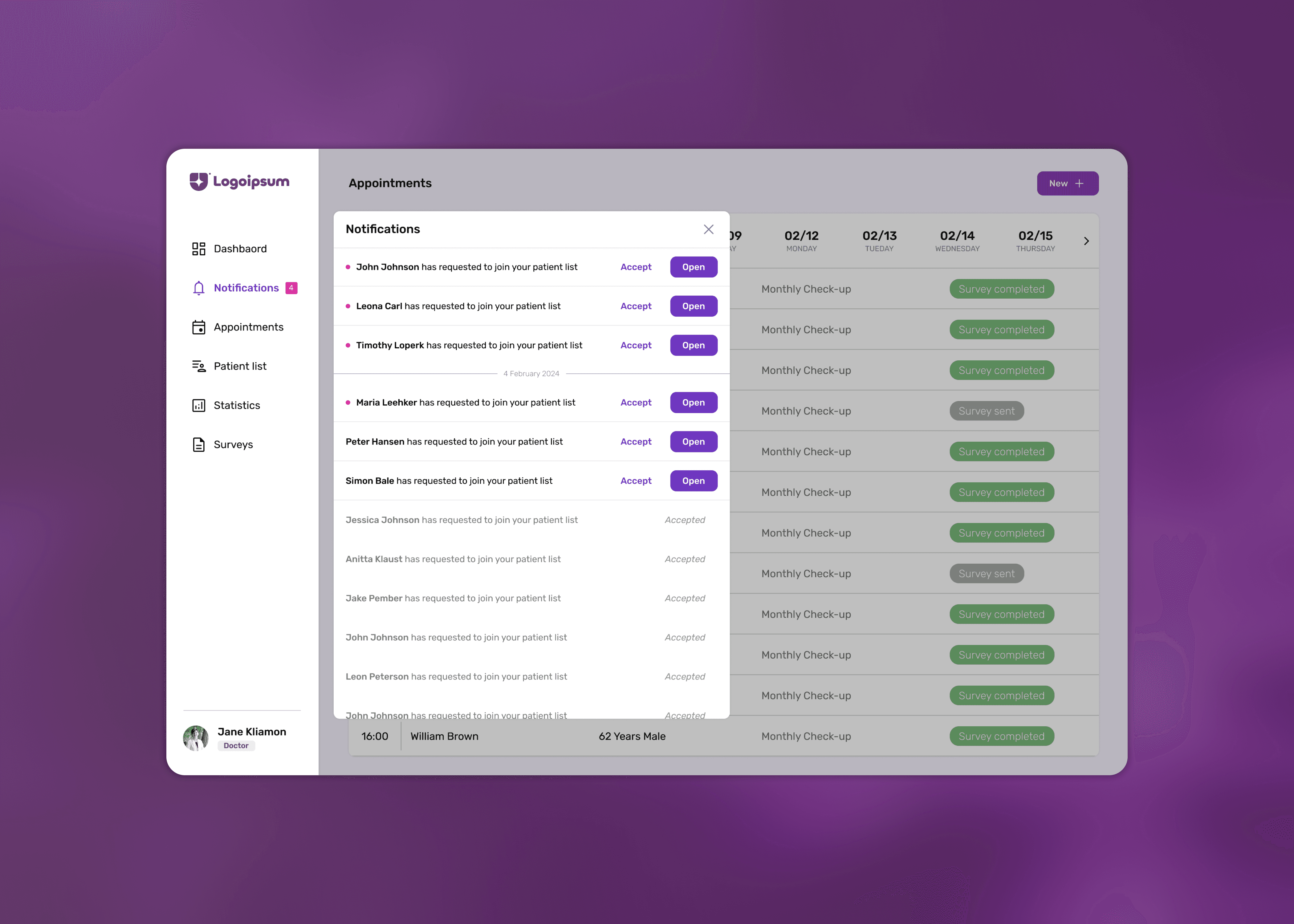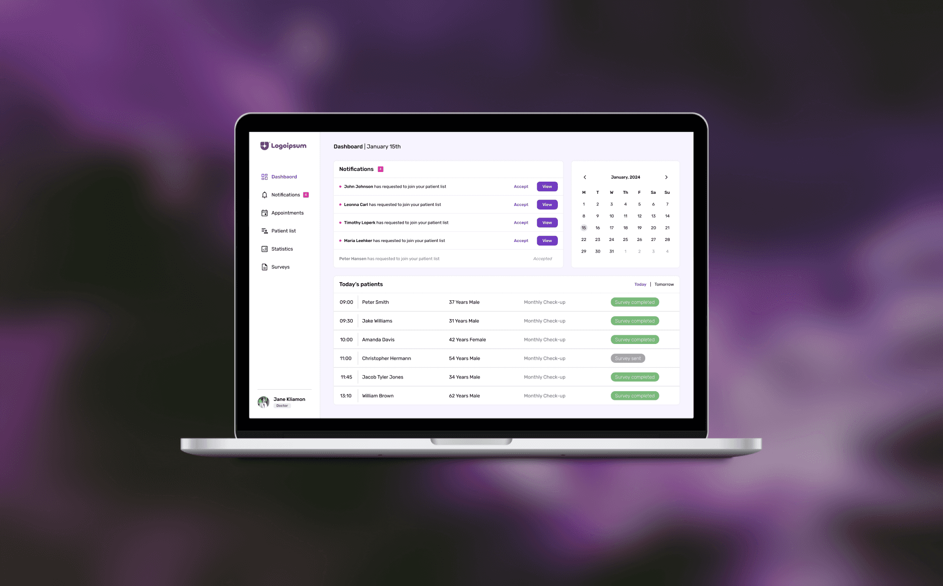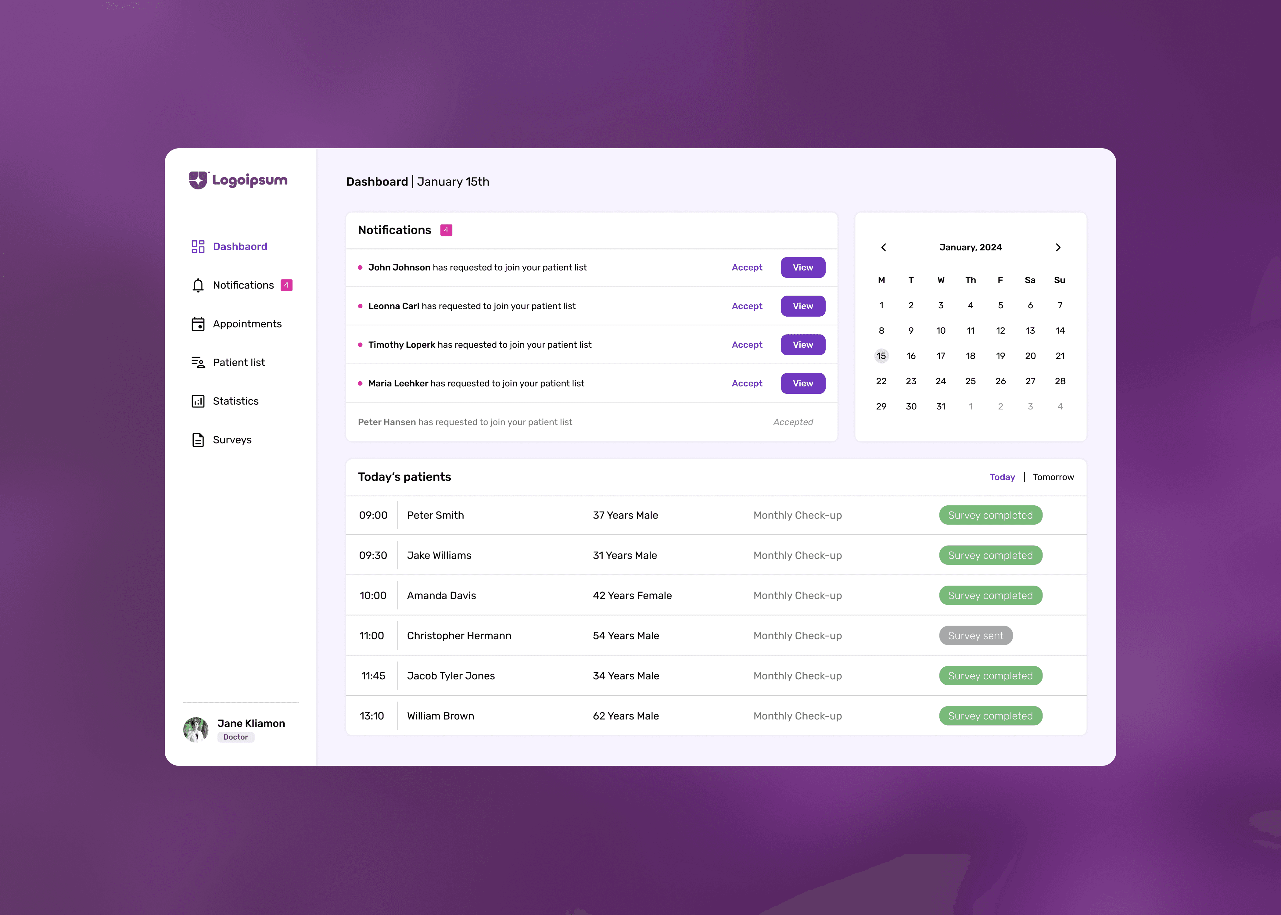 Displays key patient information and upcoming appointments, allowing doctors to have an at-a-glance overview